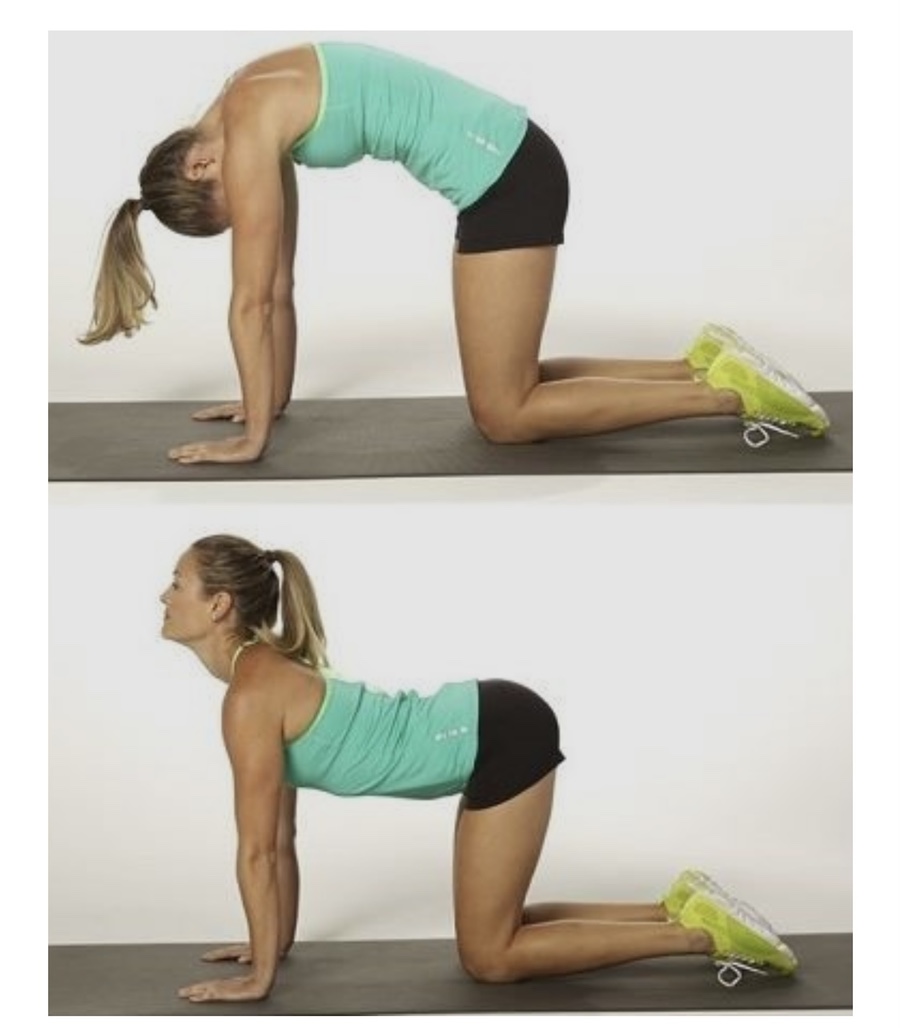 네 발로 기어서 척추를 구부리고 펴는 스트레칭입니다.